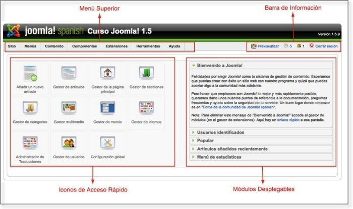En el Panel de Control de Joomla! podemos distinguir varias áreas diferenciadas: