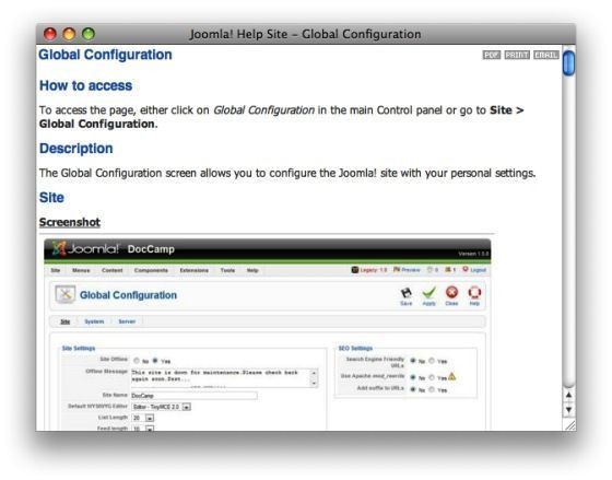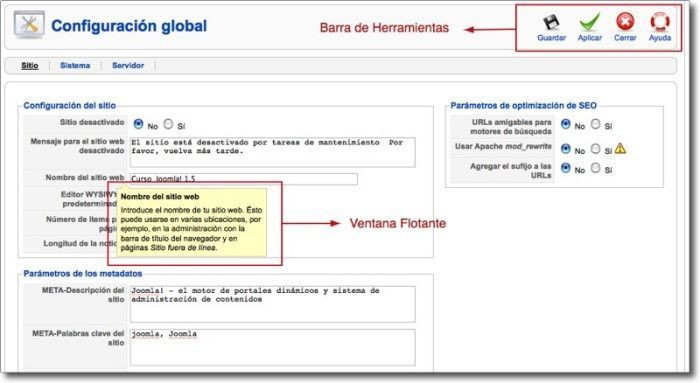 El botón ayuda hará que aparezca una ventana emergente con una descripción de las diferentes opciones de la configuración global, pero todo el sistema de ayuda está aún en inglés a la espera de que voluntarios de la comunidad joomla lo traduzcan.