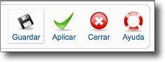 Este menú de herramientas lo vamos a ver también en otras páginas de la zona de administración que contiene los botones que nos van a permitir Guardar los cambios que realicemos y salir, Aplicar los cambios sin salir de la pantalla, Cancelar y salir o mostrar información de Ayuda.