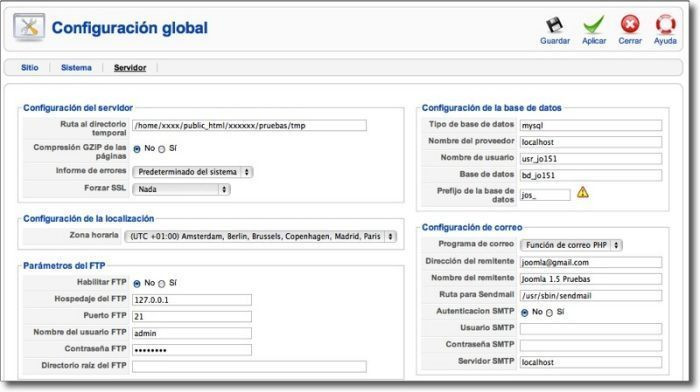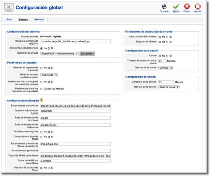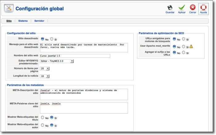 Dentro de zona de trabajo de la configuración global de Joomla veremos varias lengüetas o pestañas que nos mostrarán diferentes apartados: Sitio, sistema y servidor.
