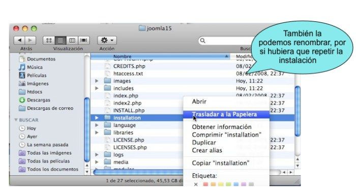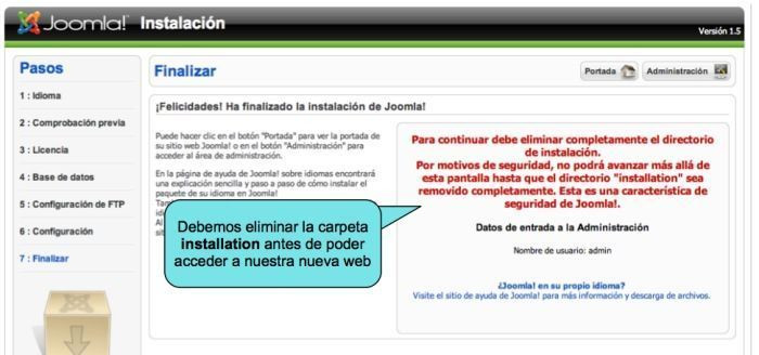 Aunque el asistente nos aconseja borrar la carpeta installation del servidor es preferible renombrarla y no suprimirla definitivamente. Podemos llamarla por ejemplo install.