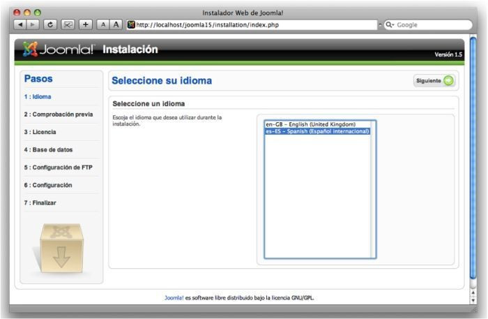 Una vez creada la base de datos y ubicados los archivos en la carpeta deseada podemos ejecutar el asistente de instalación de Joomla volviendo de nuevo a la página que habíamos abierto antes
