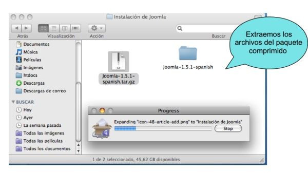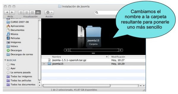Para facilitar el trabajo es conveniente renombrar esa carpeta para dejar un nombre más corto (p ej joomla).