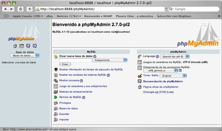 Pero si queremos asignar contraseñas y privilegios tendremos que pulsar sobre el enlace "Privilegios" de la portada de phpMyAdmin.