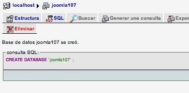 Para crear la base de datos escribimos el nombre que queramos darle (p ej. joomla15) en el recuadro "Crear nueva base de datos" y pulsamos en "crear"
