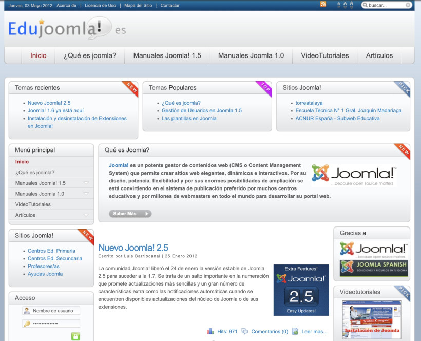 Con Joomla! podemos crear en poco tiempo un completo portal para un centro escolar o una web docente en la que publicar noticias, blogs, directorios de enlaces o documentos para descargar sin necesidad de conocimientos técnicos especiales o de complejos lenguajes de programación.